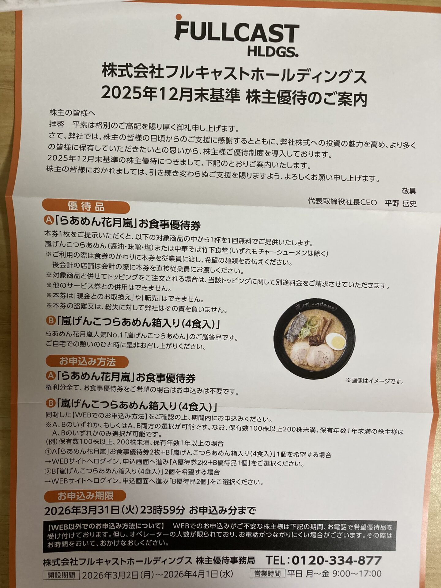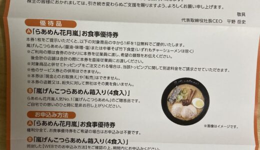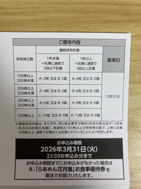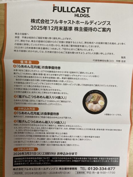 ホーム株関係 フルキャスト(4848)の優待案内が届いた。 2026/03/03 SHARE ツイート シェア はてブ Google+ Pocket LINE フルキャスト(4848)の優待案内が届いた。 案内のQRコードを読み取って申し込み。 店舗は行かないのでBを選択して注文完了。 今日の日経急落もあり、フルキャストは含み損状態だが、やはりここのラーメンは好きなので1年保有して倍の優待をもらおう^^ →優待目的でフルキャスト(4848)の株を買った。 スポンサーリンク 最後まで読んでいただきありがとうございました。 この記事が気に入っていただけたらシェアしてくれると嬉しいです。 コメントを残す コメントをキャンセル メールアドレスが公開されることはありません。 * が付いている欄は必須項目ですコメント 名前 * メール * サイト Δ